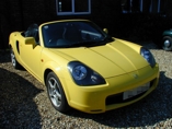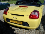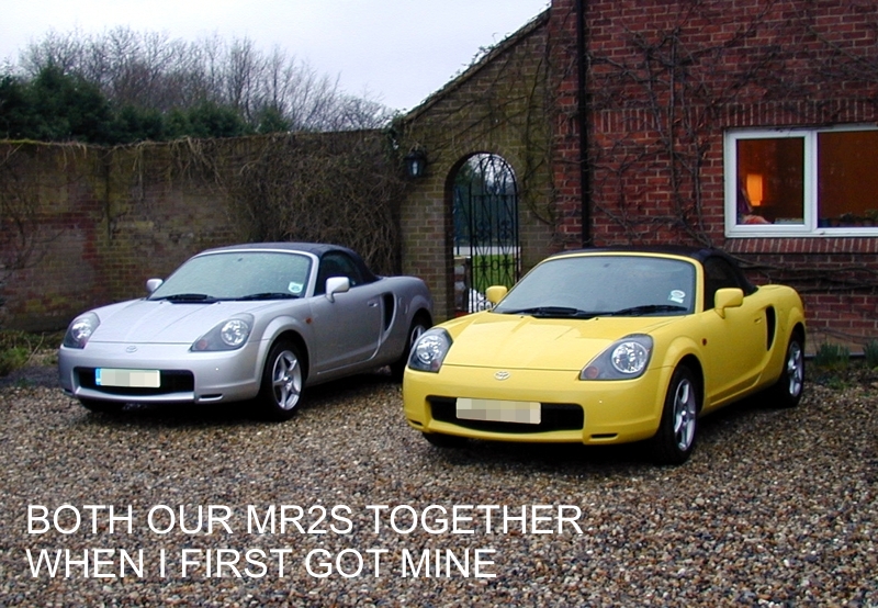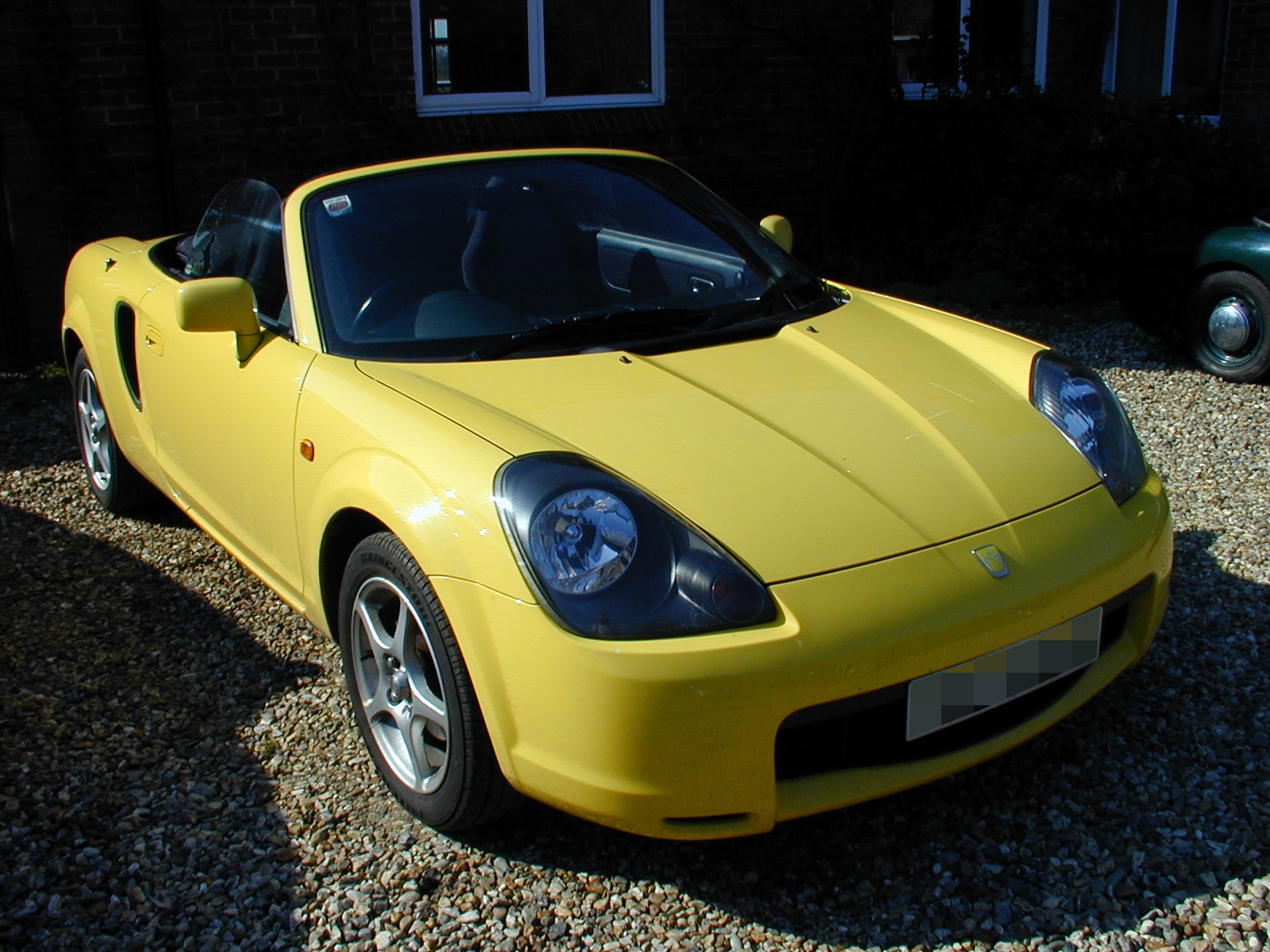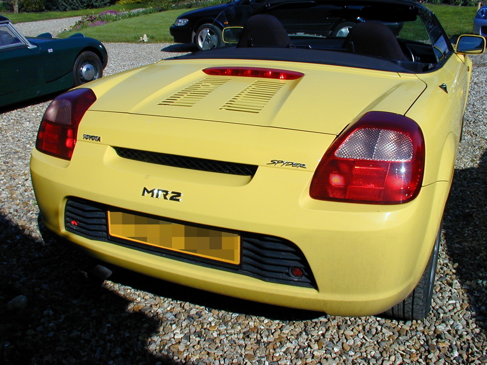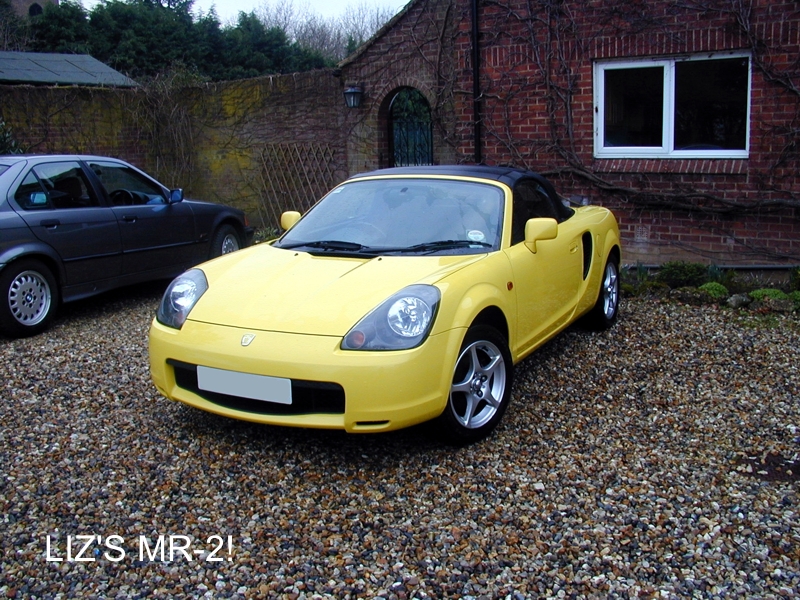 My sister Liz had her MR-2 before I got mine, and it was driving it that made me buy one! Hers is a yellow 2000 model, 5-speed manual with air-con. The only mods she has are an Alpine Stereo, a green gear-knob, a spyder rear badge and a yellow J-spec badge. UPDATE: Bama and Mongo deflectors fitted too!